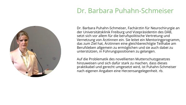Dr. Barbara Puhahn-Schmeiser, Fachärztin für Neurochirurgie an der Universitätsklinik Freiburg und Vizepräsidentin des DÄB, setzt sich vor allem für die berufspolitische Vertretung und Vernetzung von Ärztinnen ein. Sie leitet ein Mentoringprogramm, das zum Ziel hat, Ärztinnen eine gleichberechtigte Teilhabe am Berufsleben allgemein zu ermöglichen und sie auch dabei zu unterstützen, in Führungspositionen zu gelangen. Auf die Problematik des novellierten Mutterschutzgesetzes hinzuweisen und sich dafür stark zu machen, dass dieses praktikabel und gerecht umgesetzt wird, ist Puhahn-Schmeiser nach eigenen Angaben eine Herzensangelegenheit. rb.
