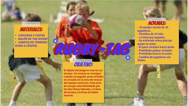 - El equipo consta de 10 jugadores.- Partidos de 10 min.- 2 cintas por jugador. - Se entiende como placaje quitar la cinta. - El pase siempre hacia atrás. - Prohibido patear el balón. - Prohibido tirarse al suelo. - Cambio de jugadores sin límite.