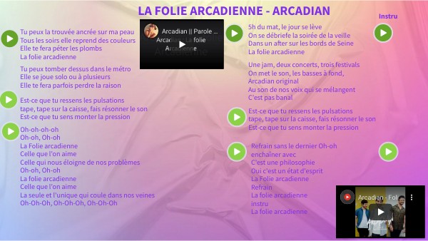 Refrain sans le dernier Oh-oh enchaîner avec C'est une philosophie Oui c'est un état d'esprit La Folie arcadienne Refrain La folie arcadienne instru La folie arcadienne