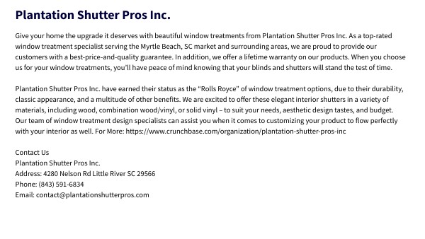 Give your home the upgrade it deserves with beautiful window treatments from Plantation Shutter Pros Inc. As a top-rated window treatment specialist serving the Myrtle Beach, SC market and surrounding areas, we are proud to provide our customers with a best-price-and-quality guarantee. In addition, we offer a lifetime warranty on our products. When you choose us for your window treatments, you’ll have peace of mind knowing that your blinds and shutters will stand the test of time. Plantation Shutter Pros Inc. have earned their status as the “Rolls Royce” of window treatment options, due to their durability, classic appearance, and a multitude of other benefits. We are excited to offer these elegant interior shutters in a variety of materials, including wood, combination wood/vinyl, or solid vinyl – to suit your needs, aesthetic design tastes, and budget. Our team of window treatment design specialists can assist you when it comes to customizing your product to flow perfectly with your interior as well. For More: https://www.crunchbase.com/organization/plantation-shutter-pros-inc Contact Us Plantation Shutter Pros Inc. Address: 4280 Nelson Rd Little River SC 29566 Phone: (843) 591-6834 Email: contact@plantationshutterpros.com