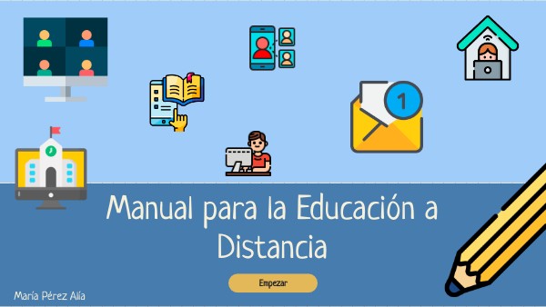 Este manual está dirigido a todos aquellos agentes educativos que necesiten una guía para impartir clases a distancia en la etapa de Educación Primaria. En él, se van a encontrar consejos y guías que, tras un análisis bibliográfico, se han visto que son útiles en esta modalidad de enseñanza. A continuación se muestra el contenido del mismo. Si se quiere volver al índice, haga click en el icono: que encontrarás en cada página.