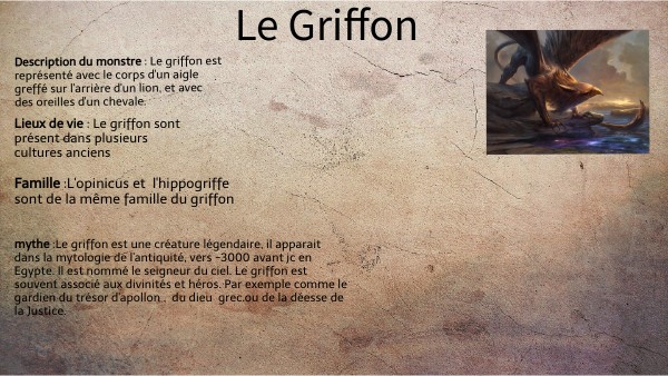 mythe :Le griffon est une créature légendaire, il apparait dans la mytologie de l'antiquité, vers -3000 avant jc en Egypte. Il est nommé le seigneur du ciel. Le griffon est souvent associé aux divinités et héros. Par exemple comme le gardien du trésor d'apollon , du dieu grec.ou de la déesse de la Justice.