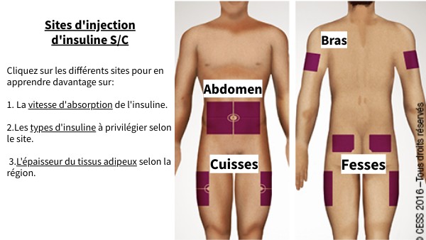 Cliquez sur les différents sites pour en apprendre davantage sur: 1. La vitesse d'absorption de l'insuline. 2.Les types d'insuline à privilégier selon le site. 3.L'épaisseur du tissus adipeux selon la région.