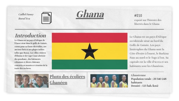 Le Ghana est un pays d'Afrique occidentale situé au bord du Golfe de Guinée. Les pays limitrophes du Ghana sont la Côte d'Ivoire à l'ouest, le Burkina Faso au nord et le Togo à l'est. Sa capitale est la ville d'Accra et ses habitants sont les Ghanéens.