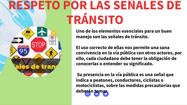 Uno de los elementos esenciales para un buen manejo son las señales de tránsito. El uso correcto de ellas nos permite una sana convivencia en la vía pública con otros actores, por ello, cada ciudadano debe tener la obligación de conocerlas o entender su significado. Su presencia en la vía pública es una señal que indica a peatones, conductores, ciclistas o motociclistas, sobre las medidas precautorias que deberán tomar.