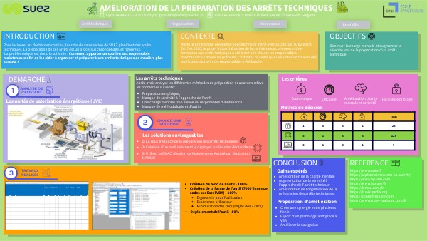 Après le programme excellence opérationnelle mené avec succès par SUEZ entre 2017 et 2020, le projet industrialisation de la maintenance commence. Une formation aux arrêts technique a été lancé afin d'aider les responsables maintenance à mieux les préparer, c'est dans ce cadre que l'initiative de trouver des outils pour soutenir ces responsables a été lancée.