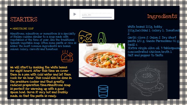 Minestrone, minestrón or menestrón is a specialty of Italian cuisine similar to a soup made with vegetables of the time of year, like the traditional Spanish vegetable soup. Often some pasta or rice is added. The most common ingredients are beans, onions, celery, carrots and tomatoes.