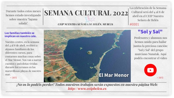 En el CEIP Nuestra Señora de Belén de Murcia hemos estado trabajando durante todo el curso sobre nuestro Mar Menor. Esperamos que os guste.