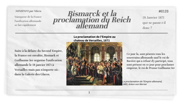 Suite à la défaite du Second Empire, la France est envahie, Bismark et Guillaume Ier organise l'unification allemande le 18 janvier 1871 à Versailles mais pas n'importe où : dans la Galerie des Glaces.