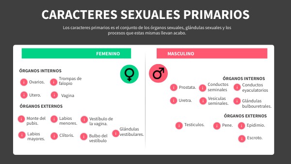 Los caracteres primarios es el conjunto de los órganos sexuales, glándulas sexuales y los procesos que estas mismas llevan acabo.