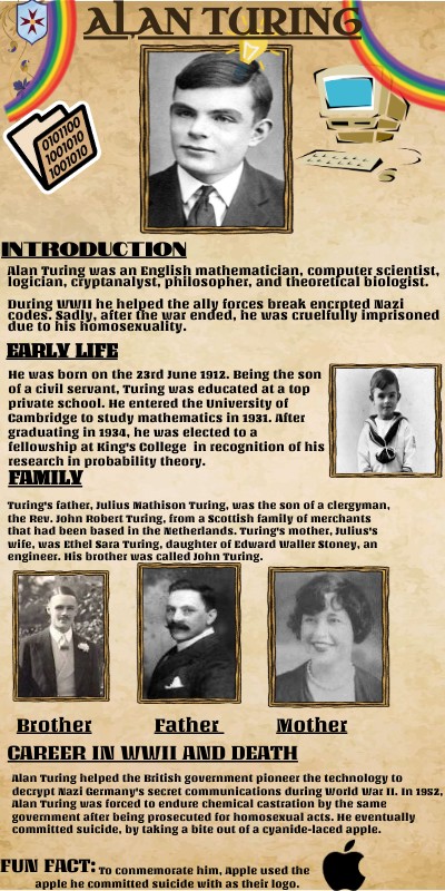 Alan Turing was an English mathematician, computer scientist, logician, cryptanalyst, philosopher, and theoretical biologist. During WWII he helped the ally forces break encripted Nazi codes. Sadly, after the war ended, he was cruelfully imprisoned due to his homosexuality.