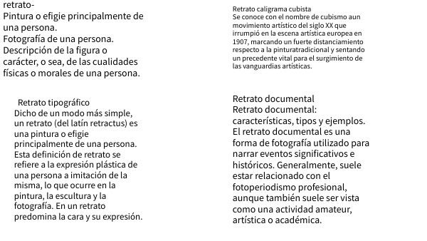 Retrato tipográfico Dicho de un modo más simple, un retrato (del latín retractus) es una pintura o efigie principalmente de una persona. Esta definición de retrato se refiere a la expresión plástica de una persona a imitación de la misma, lo que ocurre en la pintura, la escultura y la fotografía. En un retrato predomina la cara y su expresión.