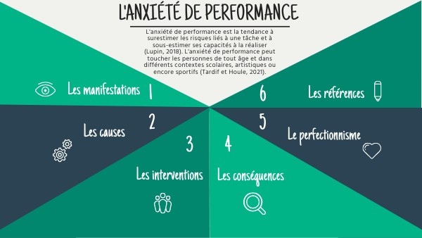 L'anxiété de performance est la tendance à surestimer les risques liés à une tâche et à sous-estimer ses capacités à la réaliser (Lupin, 2018). L'anxiété de performance peut toucher les personnes de tout âge et dans différents contextes scolaires, artistiques ou encore sportifs (Tardif et Houle, 2021).