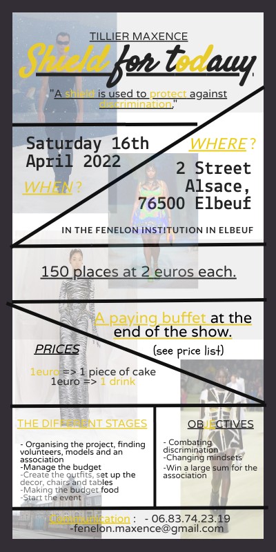 - Organising the project, finding volunteers, models and an association -Manage the budget -Create the outfits, set up the decor, chairs and tables -Making the budget food -Start the event