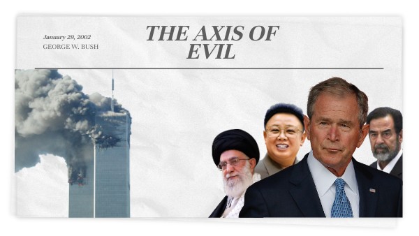 The expression designates a group of countries who plan to develop weapons of mass destruction and support terrorism. Bush names Iraq, Iran, and North Korea.