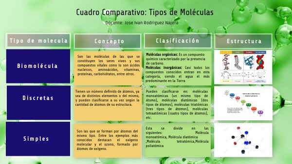 Moléculas orgánicas: Es un compuesto químico caracterizado por la presencia de carbono.