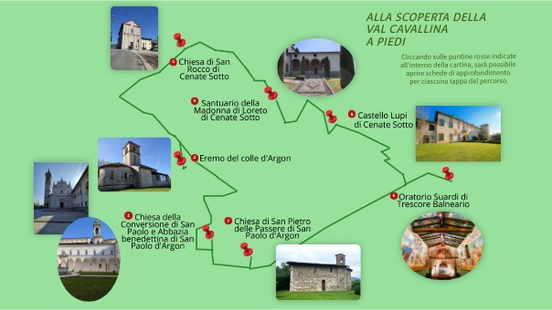 Cliccando sulle puntine rosse indicate all'interno della cartina, sarà possibile aprire schede di approfondimento per ciascuna tappa del percorso.
