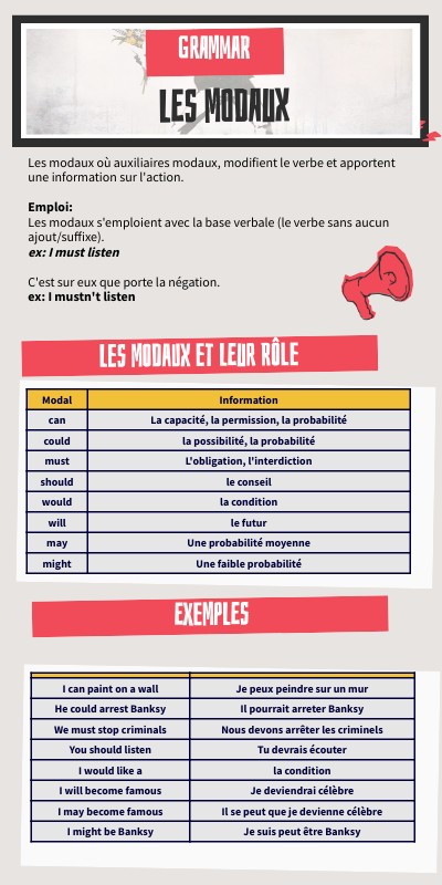Les modaux où auxiliaires modaux, modifient le verbe et apportent une information sur l'action. Emploi: Les modaux s'emploient avec la base verbale (le verbe sans aucun ajout/suffixe). ex: I must listen C'est sur eux que porte la négation. ex: I mustn't listen
