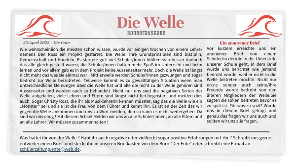 Wie wahrscheinlich die meisten schon wissen, wurde vor einigen Wochen von einem Lehrer namens Ben Ross ein Projekt gestartet. Die Welle! Ihre Grundprinzipien sind Disziplin, Gemeinschaft und Handeln. Es startete gut: viel Schüler/innen fühlten sich besser dadurch das alle gleich gestellt waren, die Schüler/innen hatten mehr Spaß im Unterricht und beim lernen und vor allem gab es in dem Projekt keine Aussenseiter mehr. Doch die Welle ist längst nicht mehr das was sie einmal war ! Mittlerweile werden Schüler/innen gezwungen und sogar bedroht zur Welle beizutreten. Teilweise kommt es zu gewalttätigen Situation wenn man unterschiedliche Meinungen über die Welle hat und alle die nicht zu der Welle gehören sind Aussenseiter und werden auch so behandelt. Nicht nur uns sind die negativen Seiten der Welle aufgefallen, viele Lehren und Eltern sind längst nicht bei begeistert und melden dies auch. Sogar Christy Ross, die ihr als Musiklehrerin kennen müsstet, sag das die Welle wie ein „Monster“ sei und sie ist die Frau von dem Führer und kennt ihn. Es ist an der Zeit das wir gegen die Welle ankommen und uns zu Wort melden, den so kann es nicht weitergehen. Da sind wir uns einig ! Mit diesem Artikel Melden wir uns an alle Schüler/innen, an alle Eltern und an alle Lehrer: Wir müssen zusammenhalten !