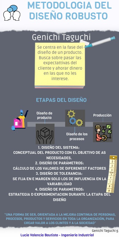 1. Diseño del sistema: Conceptual del producto con el objetivo de as necesidades. 2. Diseño de parámetros: Cálculo de los valores de diferenest factores 3. Diseño de tolerancia: Se fija en e margen solo los de influencia en la variabilidad 4. Diseño de parametros: Estrategia d experimentacion durante la etapa del diseño