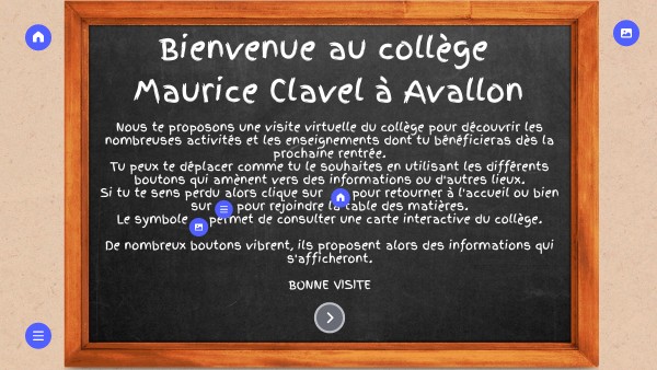 Nous te proposons une visite virtuelle du collège pour découvrir les nombreuses activités et les enseignements dont tu bénéficieras dès la prochaine rentrée. Tu peux te déplacer comme tu le souhaites en utilisant les différents boutons qui amènent vers des informations ou d'autres lieux. Si tu te sens perdu alors clique sur pour retourner à l'accueil ou bien sur pour rejoindre la table des matières. Le symbole permet de consulter une carte interactive du collège. De nombreux boutons vibrent, ils proposent alors des informations qui s'afficheront. BONNE VISITE