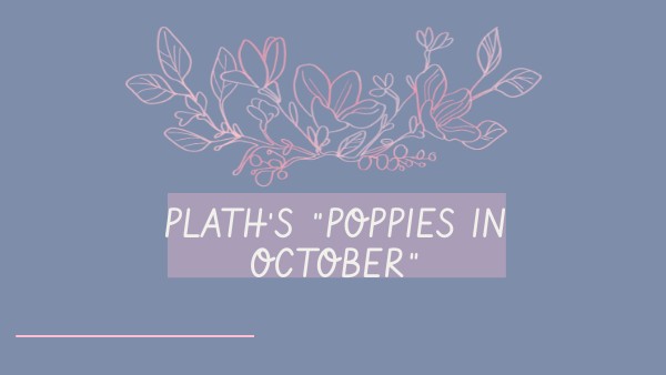 "Poppies in October" was written on Plath's last birthday in 1962, one year before her suicide. This fact is present throughout the poem with themes of blood, depression and the persona's obsession with death. Sylvia Plath's "Poppies in October" is a melancholy poem that focuses on beauty in the natural world. The speaker notices vibrant red poppies in October, when the flowers don't typically bloom. Instead of simply welcoming this lovely sight, however, the speaker juxtaposes the flowers against the ugliness of the surrounding world, comparing them with images of pollution, blood, and human indifference. In the poem, the speaker appears to bestanding in a street, staring at poppies that are not in bloom as an ambulance passes, carrying a bleeding women away.