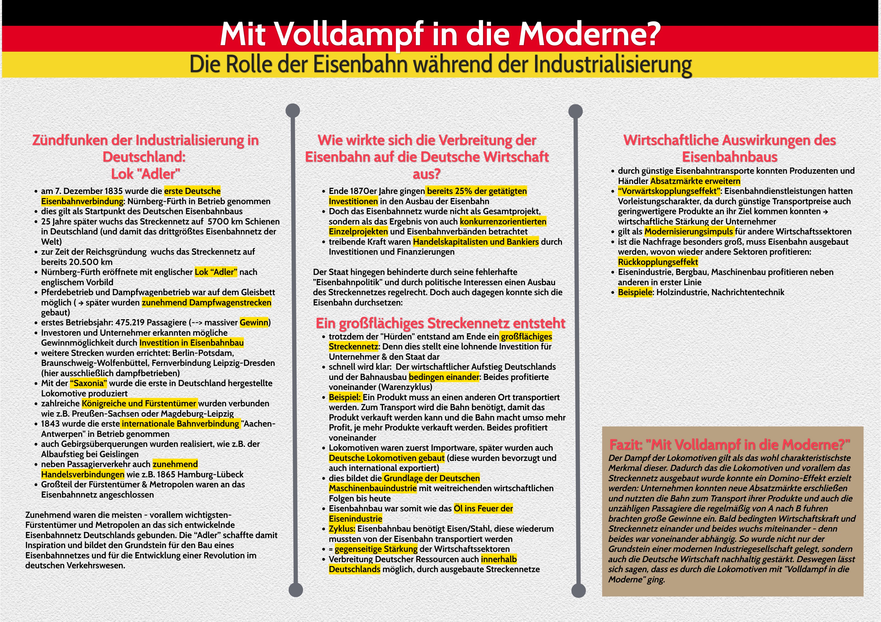 Der Dampf der Lokomotiven gilt als das wohl charakteristischste Merkmal dieser. Dadurch das die Lokomotiven und vorallem das Streckennetz ausgebaut wurde konnte ein Domino-Effekt erzielt werden: Unternehmen konnten neue Absatzmärkte erschließen und nutzten die Bahn zum Transport ihrer Produkte und auch die unzähligen Passagiere die regelmäßig von A nach B fuhren brachten große Gewinne ein. Bald bedingten Wirtschaftskraft und Streckennetz einander und beides wuchs miteinander - denn beides war voneinander abhängig. So wurde nicht nur der Grundstein einer modernen Industriegesellschaft gelegt, sondern auch die Deutsche Wirtschaft nachhaltig gestärkt. Deswegen lässt sich sagen, dass es durch die Lokomotiven mit "Volldampf in die Moderne" ging.