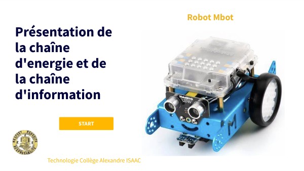 Il s'agit d'un robot Mbot du commerce. Il est doté d'une carte électronique programmable.Celle-ci peut être programmée grâce à un ordinateur soit par fil ( port USB ), soit par Wifi. On utilisera le logiciel « Mblock » pour créer nos programmes. Le langage graphique utilisé est du type « scratch ». Le robot mBot interagit avec son environnement en fonction du programme qu'on lui implante. Pour cela, il est capable de collecter des informations grâce à ses capteurs et de réaliser des actions grâce à ses actionneurs.