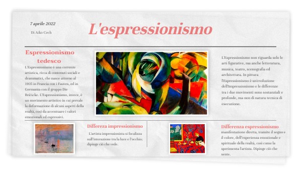 L'Espressionismo è una corrente artistica, ricca di contenuti sociali e drammatici, che nasce attorno al 1905 in Francia con i Fauves, ed in Germania con il gruppo Die Brà¼cke. L’Espressionismo, invece, è un movimento artistico in cui prevale la deformazione di alcuni aspetti della realtà, così da accentuare i valori emozionali ed espressivi.