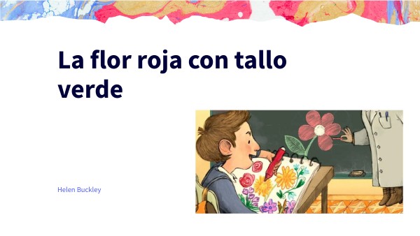 Ahora, dijo la maestra: «Vamos a dibujar flores». ¡Qué bien!, pensó el pequeño, pues le gustaba hacer flores y empezó a hacer unas flores muy bellas con sus crayones rosados, anaranjados y azules. Pero la maestra dijo: «¡Esperen!.Yo les enseñaré cómo». Y era roja, con el tallo verde.