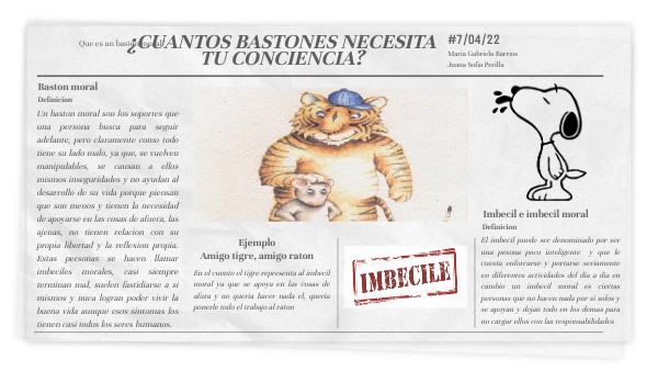 Un baston moral son los soportes que una persona busca para seguir adelante, pero claramente como todo tiene su lado malo, ya que, se vuelven manipulables, se causan a ellos mismos inseguridades y no ayudan al desarrollo de su vida porque piensan que son menos y tienen la necesidad de apoyarse en las cosas de afuera, las ajenas, no tienen relacion con su propia libertad y la reflexion propia. Estas personas se hacen llamar imbeciles morales, casi siempre terminan mal, suelen fastidiarse a si mismos y nuca logran poder vivir la buena vida aunque esos sintomas los tienen casi todos los seres humanos.