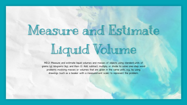 MD.2: Measure and estimate liquid volumes and masses of objects using standard units of grams (g), kilograms (kg), and liters (l). Add, subtract, multiply, or divide to solve one-step word problems involving masses or volumes that are given in the same units, e.g., by using drawings (such as a beaker with a measurement scale) to represent the problem.
