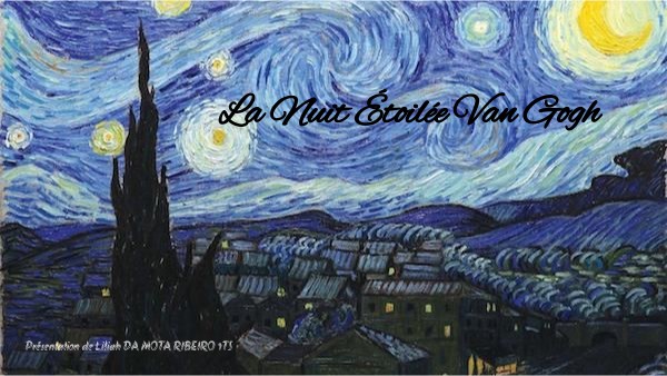 Le dessin : Van Gogh a peint ce tableau avec d’épaisses touches, très visibles et plutôt hachées. Nous pouvons supposer que le peintre a construit son tableau sur plusieurs couches de peinture avant le résultat final. Avec cette œuvre il a voulu, comme dans nombre de ces tableaux, exprimer un sentiment à travers les couleurs et le mouvement de ses pinceaux. Les couleurs : Nous pouvons voir que ce tableau est dominé par des nuances de bleus, qui représentent la nuit. Des verts foncés sont exploités pour dessiner les arbres et les maisons. Les seules couleurs chaudes, plutôt jaunes de l’œuvre, ont été peintes en petites touches pour les lumières des fenêtres, les étoiles, la lune et les voluptes du ciel. La lumière : La lumière principale provient de la lune, qui se trouve en haut à droite du tableau. Il n’y a pas vraiment de zones d’ombres puisque le ciel est lui-même illuminé par diverses étoiles et que le village compte encore quelques maisons éclairées, malgré l’heure apparemment tardive.
