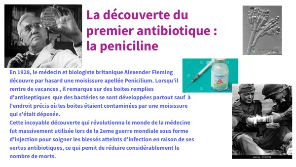 En 1928, le médecin et biologiste britanique Alexender Fleming découvre par hasard une moisissure apellée Penicilium. Lorsqu'il rentre de vacances , il remarque sur des boites remplies d'antiseptiques que des bactéries se sont développées partout sauf à l'endroit précis où les boites étaient contaminées par une moisissure qui s'était déposée. Cette incoyable découverte qui révolutionna le monde de la médecine fut massivement utilisée lors de la 2eme guerre mondiale sous forme d'injection pour soigner les blessés atteints d'infection en raison de ses vertus antibiotiques, ce qui pemit de réduire considérablement le nombre de morts.