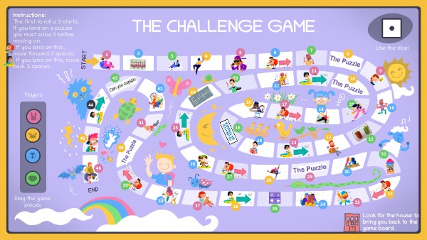 Instructions: The first to roll a 3 starts. If you land on a puzzle you must solve it before moving on. If you land on this , move forward 3 spaces. If you land on this, move back 3 spaces.