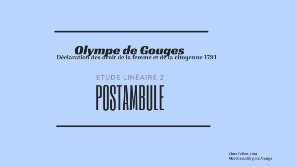 Conclusion: La stratégie argumentative qu'Olympe de Gouges adopte pour inciter les femmes à se battre pour obtenir l'égalité est dans premier temps, leur montrer clairement qu'il est temps de réagir et de se rebeller , puis dans un second temps, de créer un dialogue en utilisant l'argumentation directe, ce qui permet de monter directement les inégalités et les raisons de se battre et dans un troisième temps de dire clairement que si les femmes veulent faire changer quelque chose, il faut agir maintenant car elles en ont les capacités . On peut comparer ce texte avec Femme, soyez soumises à vos maris, de Voltaire dans car même si ces 2 oeuvres sont différentes, car l'une est un texte qui appelle clairement les femmes à la rébellion (argumentation directe) et l'autre est un dialogue entre 2 personnes (argumentation indirecte), les deux évoquent les inégalités hommes-femmes et par leur ton polémique appellent implicitment (pour Voltaire) ou explicitement (pour ODG) au combat.