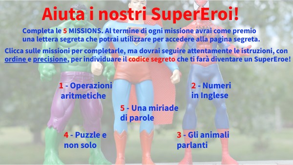 Clicca sulle missioni per completarle, ma dovrai seguire attentamente le istruzioni, con ordine e precisione, per individuare il codice segreto che ti farà diventare un SuperEroe!