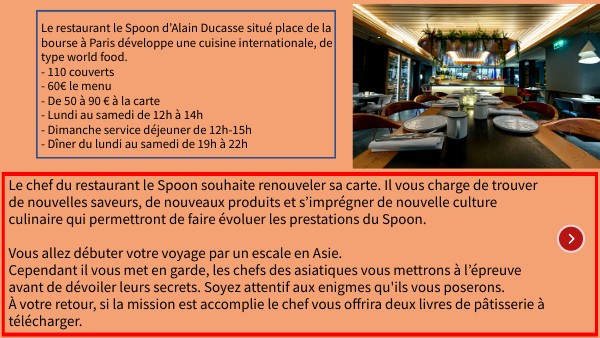 Le chef du restaurant le Spoon souhaite renouveler sa carte. Il vous charge de trouver de nouvelles saveurs, de nouveaux produits et s’imprégner de nouvelle culture culinaire qui permettront de faire évoluer les prestations du Spoon. Vous allez débuter votre voyage par un escale en Asie. Cependant il vous met en garde, les chefs des asiatiques vous mettrons à l’épreuve avant de dévoiler leurs secrets. Soyez attentif aux enigmes qu'ils vous poserons. À votre retour, si la mission est accomplie le chef vous offrira deux livres de pâtisserie à télécharger.