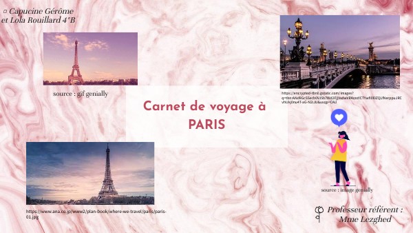 Ce carnet de voyage m'a donné envie de partir à Paris pour ses nombreux monuments et lieux de visites. Le lieu qui m'intèresse le plus est les catacombes parce qu'il n'y en a pas partout, c'est plutôt rare ! Je n'aurai pas visité une autre ville car Paris est une ville assez "complète" il y a beaucoup d'activitées dedans. Si j'avais eu plus de temps, j'aurai bien voulu faire une visite de la ville en bateaux.