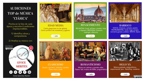 Pincha en la foto de cada época y escucha 6 audiciones imprescindibles. 1) Identifica obras y compositores. 2) Analiza su música con: