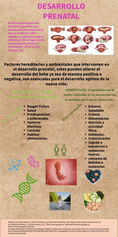 Factores hereditarios y ambientales que intervienen en el desarrollo prenatal, estos pueden alterar el desarrollo del bebe ya sea de manera positiva o negativa, son esenciales para el desarrollo optimo de la nueva vida.