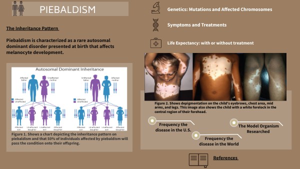 The Inheritance Pattern Piebaldism is characterized as a rare autosomal dominant disorder presented at birth that affects melanocyte development.
