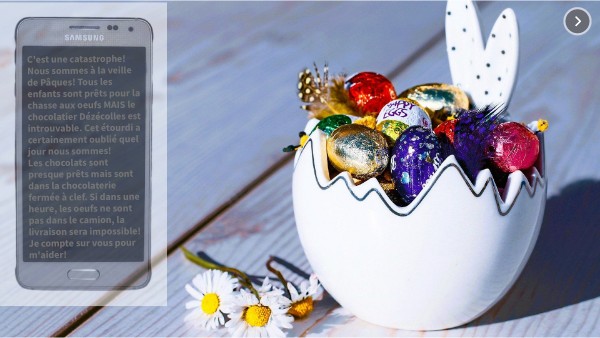 C'est une catastrophe! Nous sommes à la veille de Pâques! Tous les enfants sont prêts pour la chasse aux oeufs MAIS le chocolatier Dézécolles est introuvable. Cet étourdi a certainement oublié quel jour nous sommes! Les chocolats sont presque prêts mais sont dans la chocolaterie fermée à clef. Si dans une heure, les oeufs ne sont pas dans le camion, la livraison sera impossible! Je compte sur vous pour m'aider!