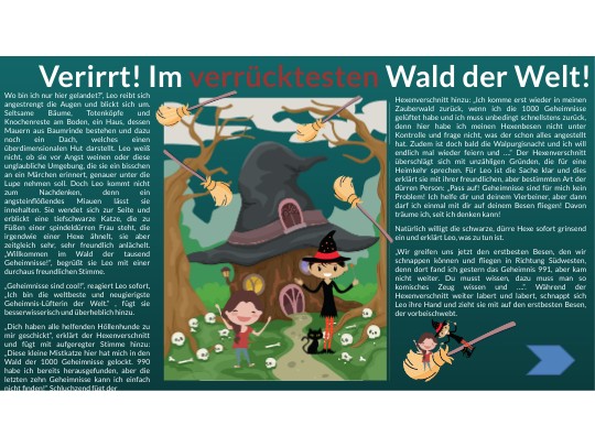 Wo bin ich nur hier gelandet?“, Leo reibt sich angestrengt die Augen und blickt sich um. Seltsame Bäume, Totenköpfe und Knochenreste am Boden, ein Haus, dessen Mauern aus Baumrinde bestehen und dazu noch ein Dach, welches einen überdimensionalen Hut darstellt. Leo weiß nicht, ob sie vor Angst weinen oder diese unglaubliche Umgebung, die sie ein bisschen an ein Märchen erinnert, genauer unter die Lupe nehmen soll. Doch Leo kommt nicht zum Nachdenken, denn ein angsteinflößendes Miauen lässt sie innehalten. Sie wendet sich zur Seite und erblickt eine tiefschwarze Katze, die zu Füßen einer spindeldürren Frau steht, die irgendwie einer Hexe ähnelt, sie aber zeitgleich sehr, sehr freundlich anlächelt. „Willkommen im Wald der tausend Geheimnisse!“, begrüßt sie Leo mit einer durchaus freundlichen Stimme. „Geheimnisse sind cool!“, reagiert Leo sofort, „Ich bin die weltbeste und neugierigste Geheimnis-Lüfterin der Welt.“ , fügt sie besserwisserisch und überheblich hinzu. „Dich haben alle helfenden Höllenhunde zu mir geschickt“, erklärt der Hexenverschnitt und fügt mit aufgeregter Stimme hinzu: „Diese kleine Mistkatze hier hat mich in den Wald der 1000 Geheimnisse gelockt. 990 habe ich bereits herausgefunden, aber die letzten zehn Geheimnisse kann ich einfach nicht finden!“ Schluchzend fügt der