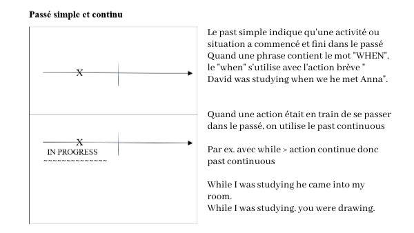 Le past simple indique qu'une activité ou situation a commencé et fini dans le passé Quand une phrase contient le mot "WHEN", le "when" s'utilise avec l'action brève " David was studying when we he met Anna". Quand une action était en train de se passer dans le passé, on utilise le past continuous Par ex. avec while > action continue donc past continuous While I was studying he came into my room. While I was studying, you were drawing.