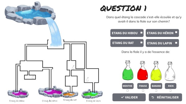 Dans quel étang la cascade s'est-elle écoulée et qu'y avait-il dans les fioles sur son chemin?