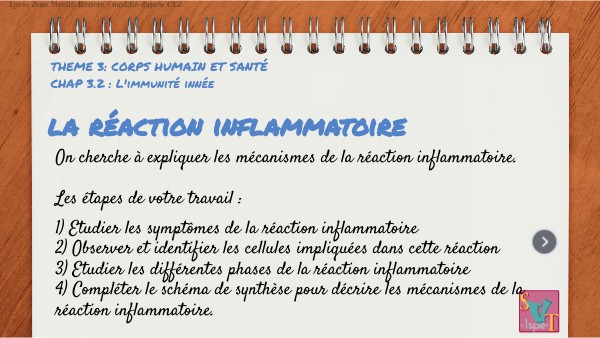 1) Etudier les symptômes de la réaction inflammatoire 2) Observer et identifier les cellules impliquées dans cette réaction 3) Etudier les différentes phases de la réaction inflammatoire 4) Compléter le schéma de synthèse pour décrire les mécanismes de la réaction inflammatoire.