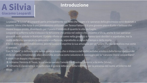 La poesia "A Silvia" di Leopardi parla principalmente del fatto che i sogni e le speranze della giovinezza sono destinati a svanire. Silvia (che forse è uno pseudonimo utilizzato per Teresa Fattorini) è una giovane piena di vita e bellezza che muore troppo presto, diventando per il poeta il simbolo di quanto la vita sia fragile. Leopardi si sofferma sulla tristezza e la delusione che prova nel vedere che, insieme a Silvia, anche le sue speranze giovanili sono andate in frantumi. Il poeta riflette su come nella gioventù si hanno tanti desideri e aspettative, ma la realtà della vita spesso porta delusione e sofferenza, soprattutto a causa del tempo e della morte. Il tono della poesia è malinconico, perché Leopardi esprime la sua amarezza per un futuro che non si realizza mai come si sperava. Con “A Silvia” si definisce una forma poetica nuova che si distacca dall’endecasillabo sciolto e dalla forma tradizionale della canzone, rimandando alla canzonetta arcadica come soluzione di passaggio per la “canzone libera Leopardiana”. Il titolo è un doppio riferimento: ⁃ richiama l’Aminta di Tasso, in cui viene narrato l’amore tra il pastore (Aminta) e la ninfa (Silvia); ⁃ richiama il classicismo e in particolare il genere letterario della tragedia, per la presenza del nome all’interno del titolo.