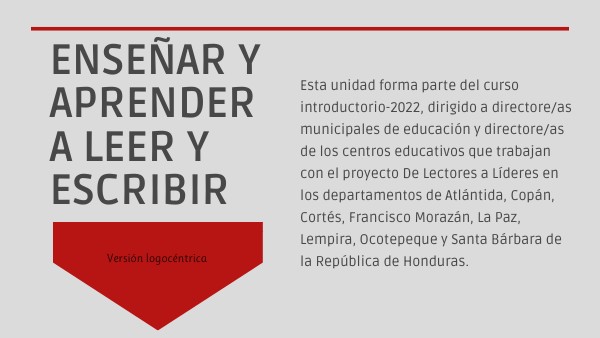 Esta unidad forma parte del curso introductorio-2022, dirigido a directore/as municipales de educación y directore/as de los centros educativos que trabajan con el proyecto De Lectores a Líderes en los departamentos de Atlántida, Copán, Cortés, Francisco Morazán, La Paz, Lempira, Ocotepeque y Santa Bárbara de la República de Honduras.