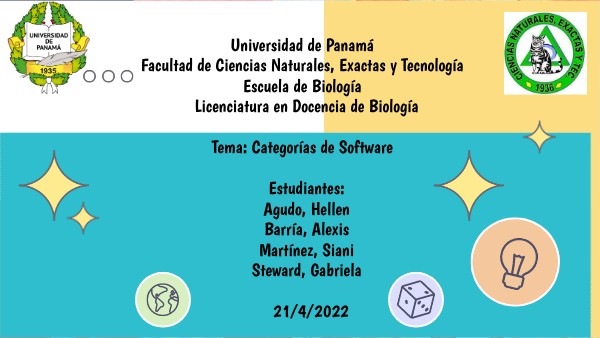 Universidad de Panamá Facultad de Ciencias Naturales, Exactas y Tecnología Escuela de Biología Licenciatura en Docencia de Biología Tema: Categorías de Software Estudiantes: Agudo, Hellen Barría, Alexis Martínez, Siani Stewart, Gabriela 21/4/2022